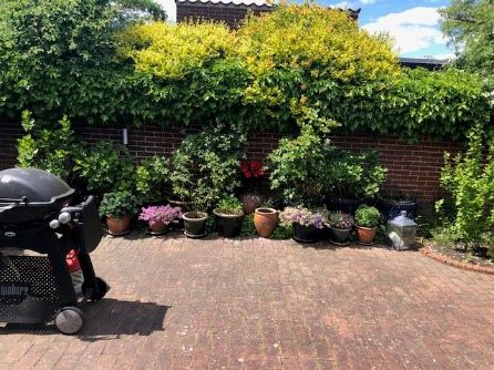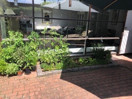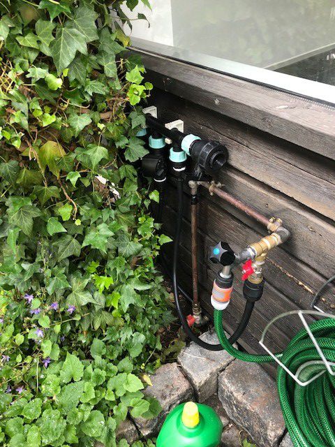 Vi har 39 krukker og 5 små bede, som alle skulle vandes automatisk. Dertil kommer, at nogle af bedene og en del af krukkerne er under tag. Vi har et meget stort udhæng, der gør, at disse bede og krukker ikke får regnvand som resten af haven.