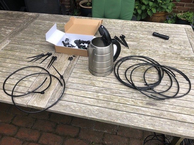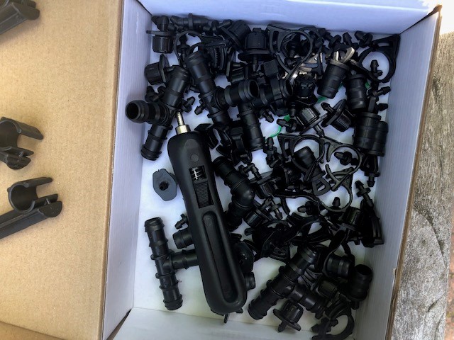 Til gengæld var det utroligt nemt at installere selve vandingssystemet. Efter en kort snak med Peter aftalte vi at jeg skulle lave en hurtig tegning (med mål) over hvad jeg havde tænkt mig der skulle vandes, så kunne Peter regne ud, hvad jeg havde brug for og sende det hele i en stor pakke.