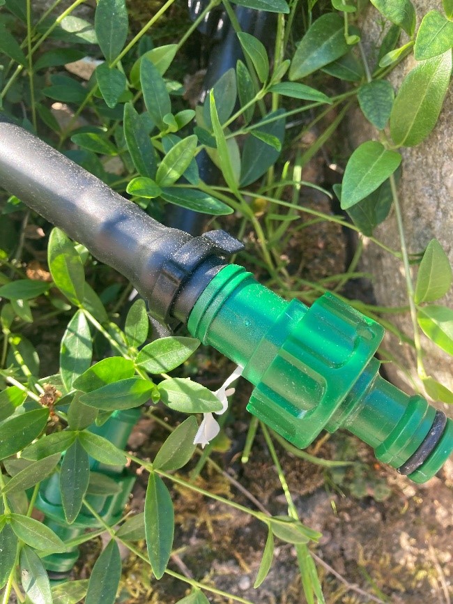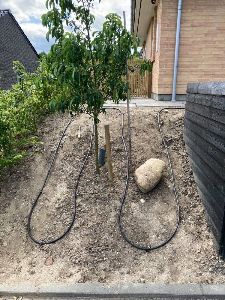 - En 16 mm slange der ligger langs med forhaven hvorfra der udgår 6 mm slanger med en sprinkler forenden til hver af buskene og træerne. Dette system er til at vande buske og træer som har brug for ekstra vand for at leve på skråningen