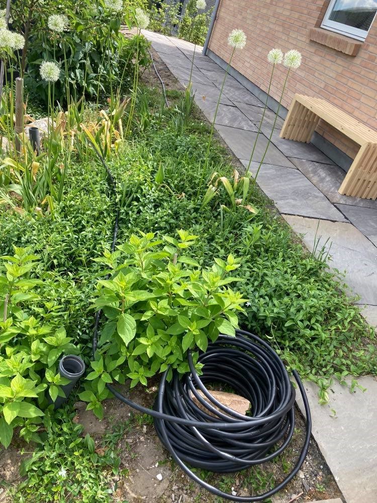 - En 16 mm drypslange som ligger fordelt over hele forhaven og bruges til at vande så bunddækket får fat efter plantning og i tørre perioder. Da forhaven skråner meget har planterne brug for lidt ekstra hjælp