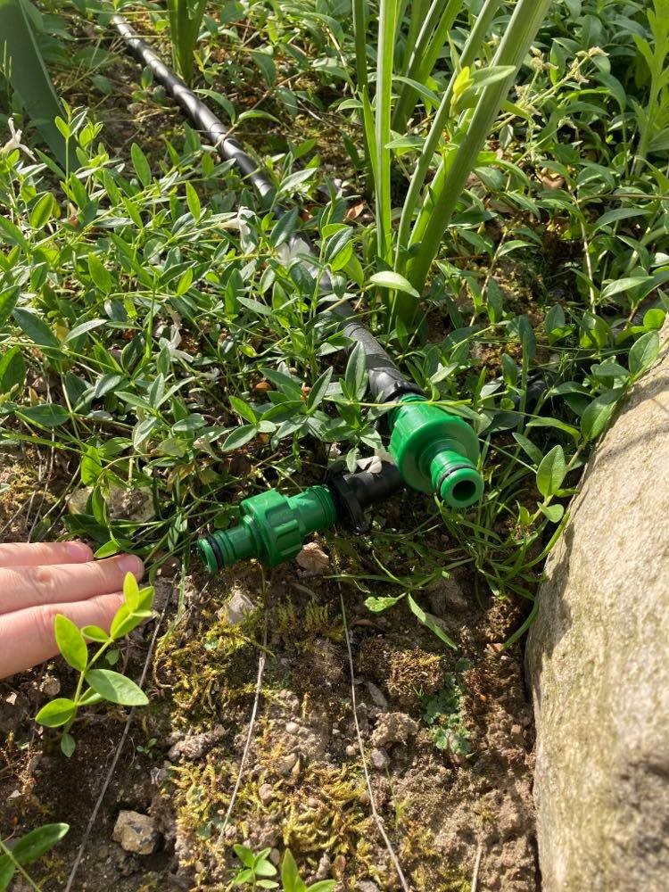 - Monter de mindre elementer én ad gangen – start fra den ene ende. I mit tilfælde startede jeg med tilkobling og så fulgte jeg slangen og satte løbende udtag til 6 mm slanger, T-stykker, sprinklere, osv.