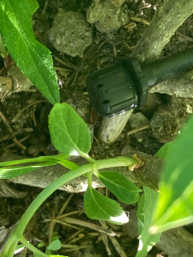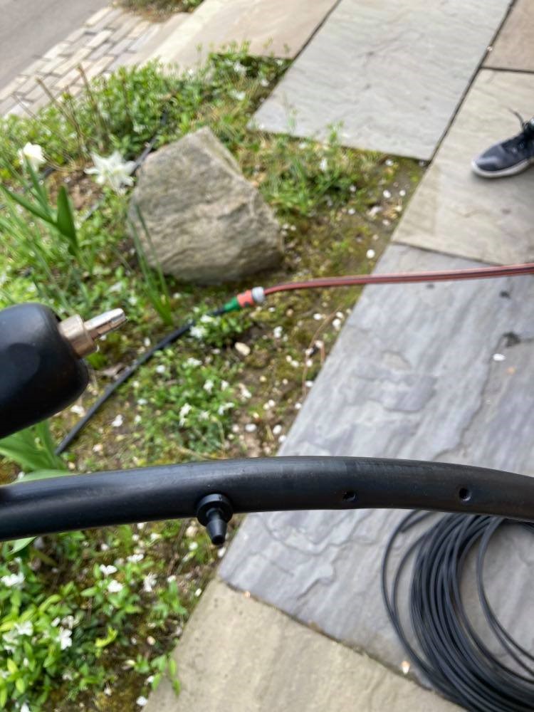 - 20. Sprinkler monteret for enden af 6 mm slangen og er her sat i midten af en hortensia- Næste gang ville jeg vælge sprinkler på jordspyd så den kan sprinkle ’vandret’, men det virker stadig til formålet da vi bare havde brug for ekstra vanding der og ikke så meget selve sprinklerfunktionen
