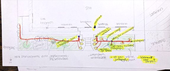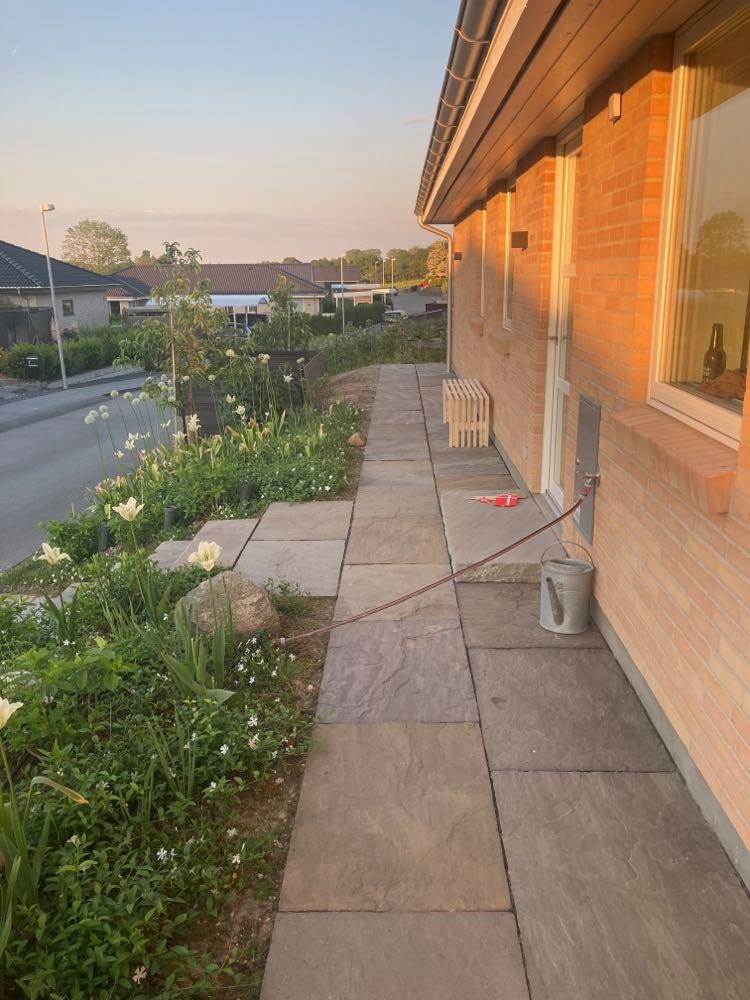 - 12. Start fra den ene ende – her er tilkoblingerne til de to systemer der er i forhaven. De er lagt så tæt ved vandhanen som muligt