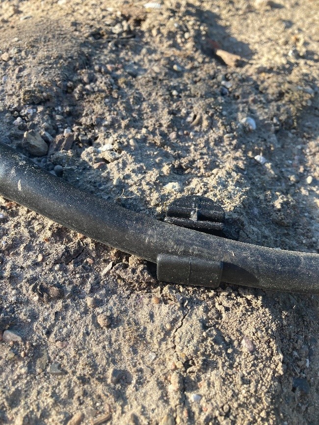 - 19. Udtag til 6 mm slanger – først laves der hul i slangen, så sættes 6 mm udtaget i og derefter sættes 6 mm slange fast. For enden af slangen er der en sprinkler- Her er der 3 udtag efter hinanden da vi har 3 buske der skal vandes med hver deres sprinkler.