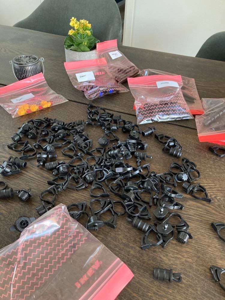 - Sorter delene og marker dem – jeg puttede dem i plastikposer med en label på. På den måde kunne jeg lige danne mig et overblik over hvad jeg havde og det var lettere at finde når det skulle sættes op