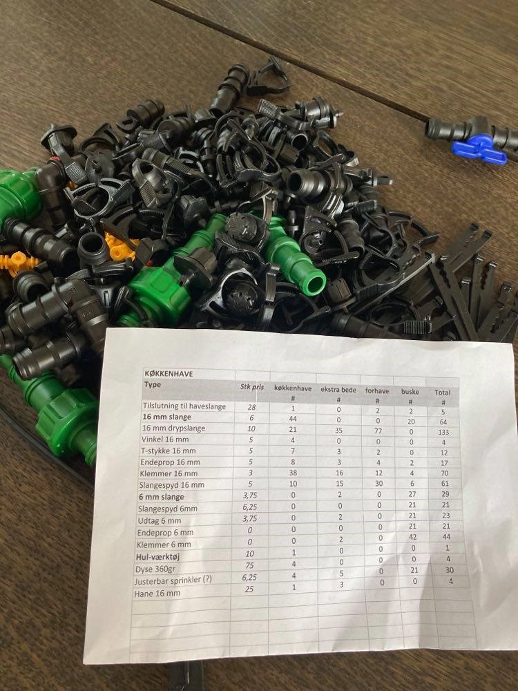 - Første bed bliver vandet med 16 mm drypslange som udgår fra hovedslangen. Overvejer at lave 6 mm udtag med sprinkler for enden som tilfører frisk vand til spejlbassinet.